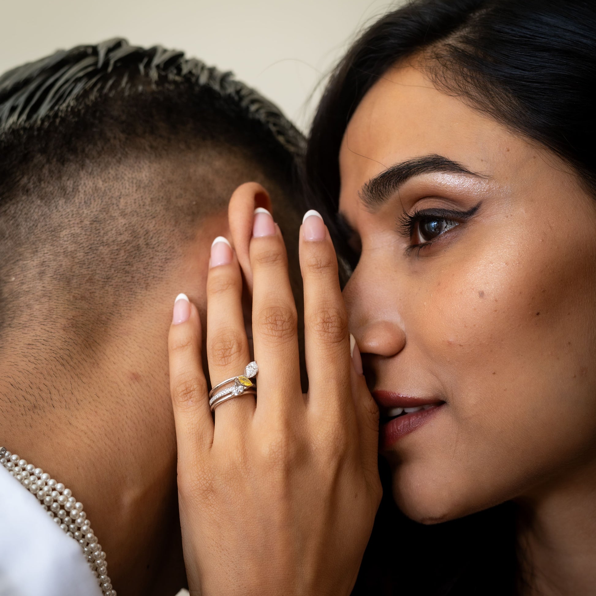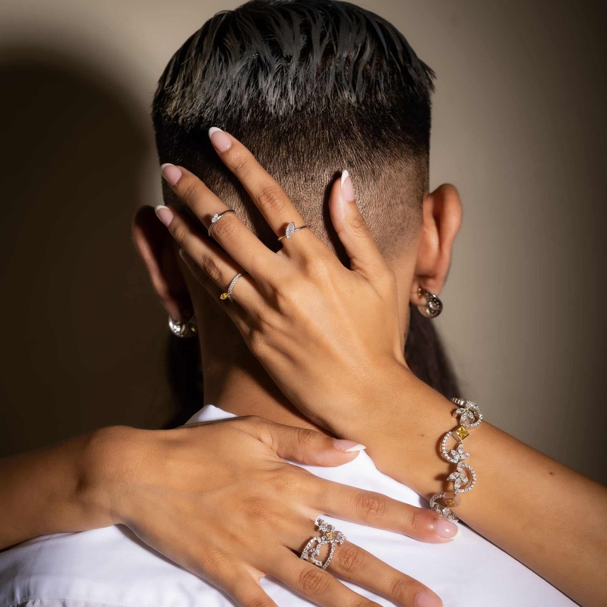 A set of 3 rings. A play on the marquise in 3 different ways. A yellow marquise atop a studded band. 2 round stones sitting inside silver in the shape of a marquise. The illusion of it all. One classic version, of a large marquise atop a simple thin band. Stack them as you like or one in each finger. It’s all up to you. It’s just as multi faceted as Mr. Tony Curtis himself.