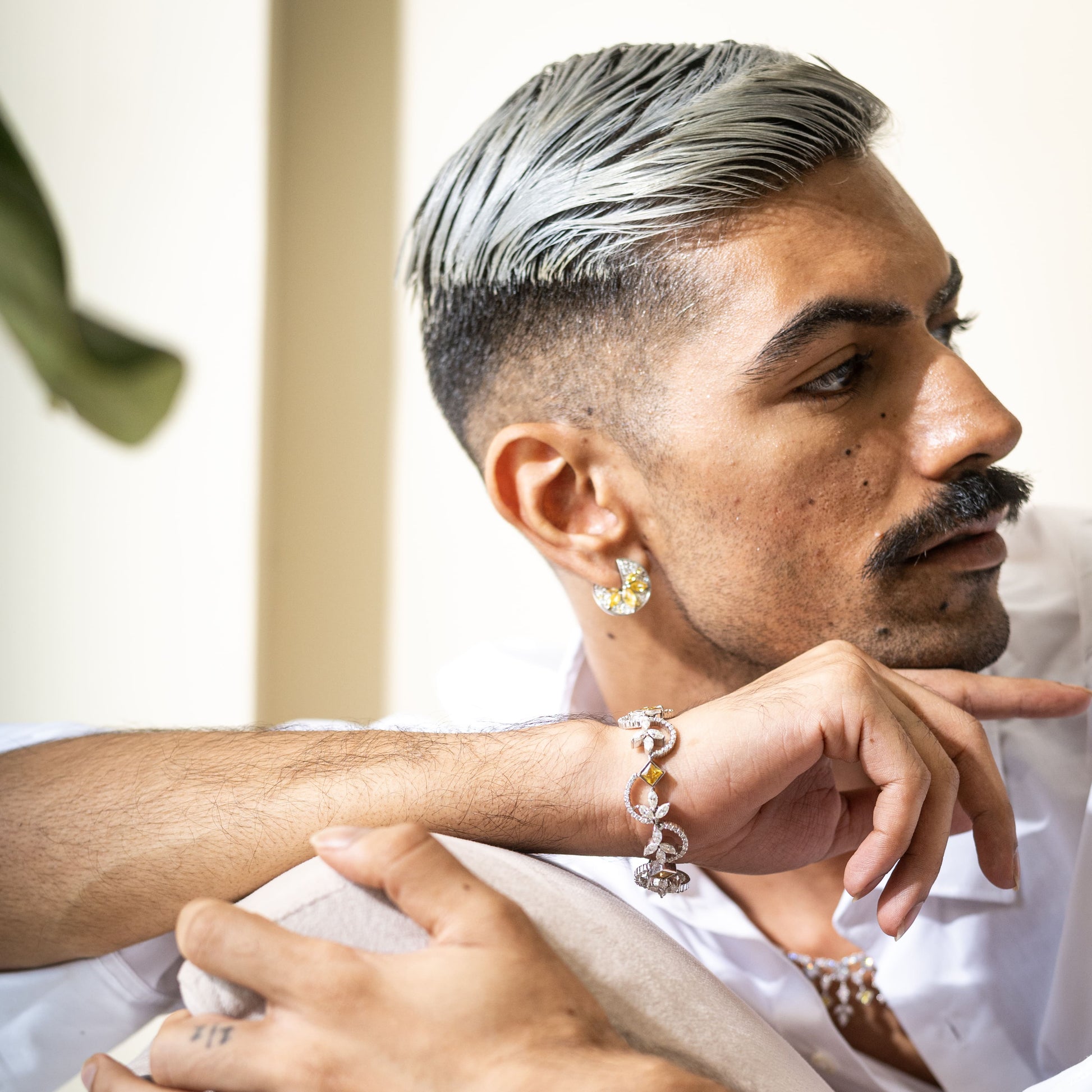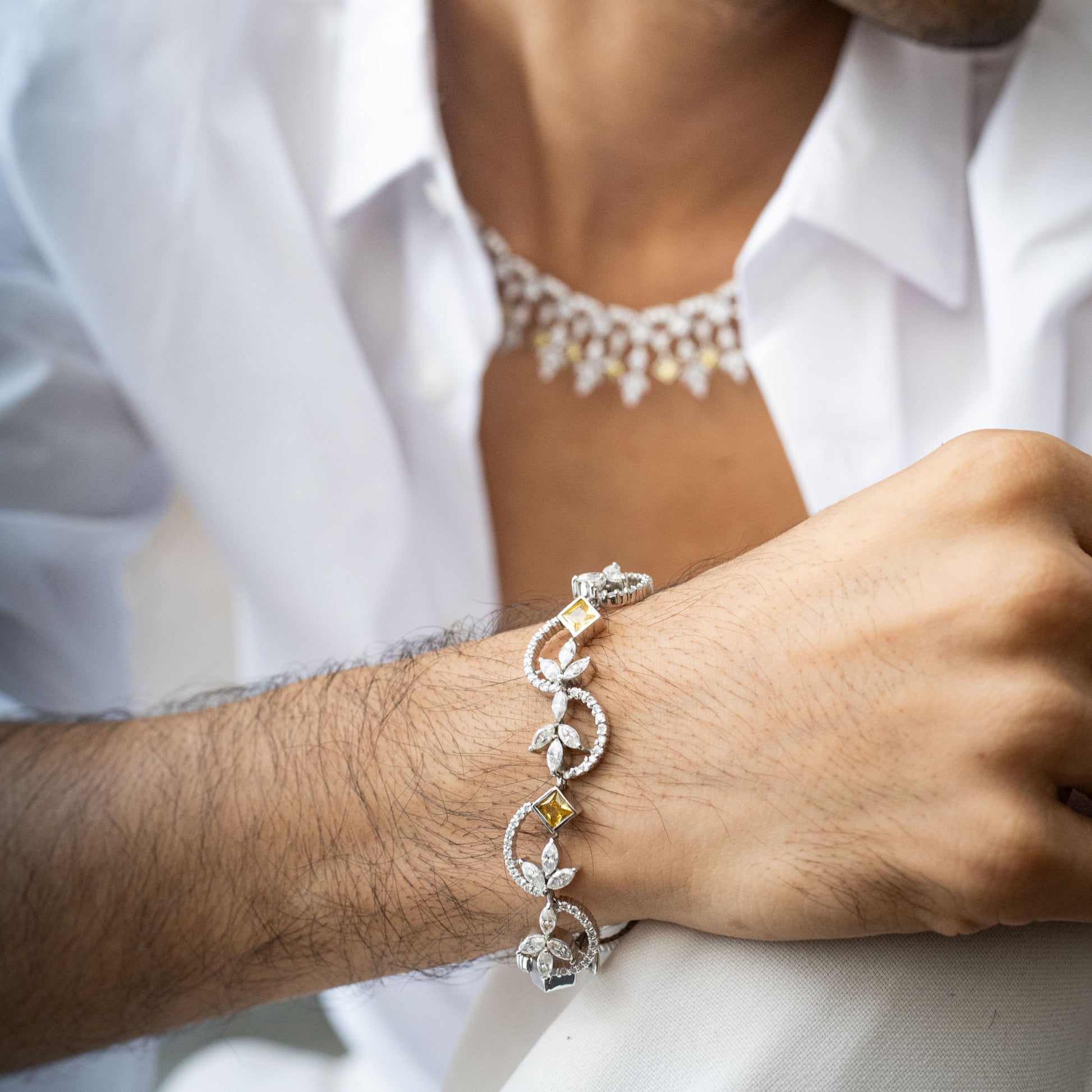 A bracelet which emulates the soft and easy charm of Ms.Audrey Kathleen Hepburn. A leaf inspired motif consisting of 3 marquise stones makes its way through a curved vine inspired by creeper plants, adorns your wrist. A touch of yellow stones to brighten and romanticize the bracelet. It’s playful, elegant, uplifting.