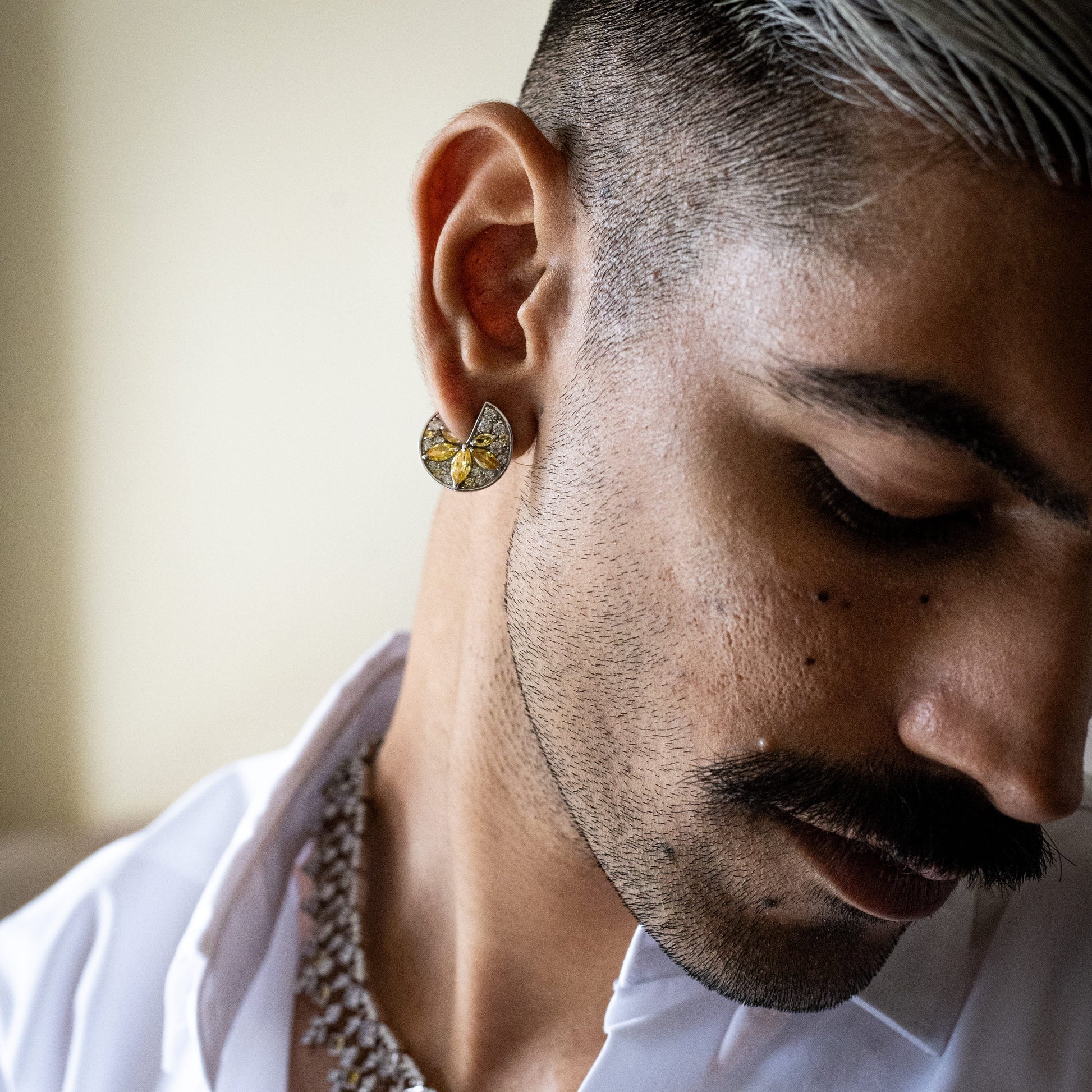Named after Kim Novak, known for her starring role in the film ‘Vertigo’. This set of earrings will leave your head spinning and you in a trance. A design which perfectly mixes the elegance and sensuality we were hoping for. 5 yellow marquise’ are arranged to look like petals of a flower. The technical aspects of this piece make it so that it curves around the back of your ear. We affectionately call it the ‘splicer’ because not only is it sliced in the middle it’ll also cut it’s way through the noise and into your heart.